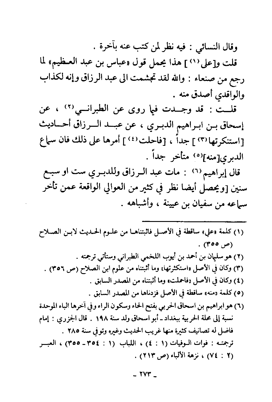 وقال النسائي فيه نظر لمن كتب عنه بأخرة قلت و [على (1) ] هذا يحمل قول عباس بن عبد العظيم لما رجع من صنعاء والله لقد تجشمت إلى عبد الرزاق وإنه لكذاب والواقدي أصدق منه قلت قد وجدت فيما روى الطبراني عن إسحاق بن إبراهيم الدبري عن عبد الرزاق أحاديث [استنكرتها (3) ] جدا [فأحلت (4) ] أمرها على ذلك فإن سماع الدبري [منه] (5) متأخر جدا قال إبراهيم مات عبد الرزاق وللدبري ست أو سبع سنين [ويحصل أيضا نظر في كثير من العوالي الواقعة عمن تأخر سماعه من سفيان بن عيينة وأشباهه.