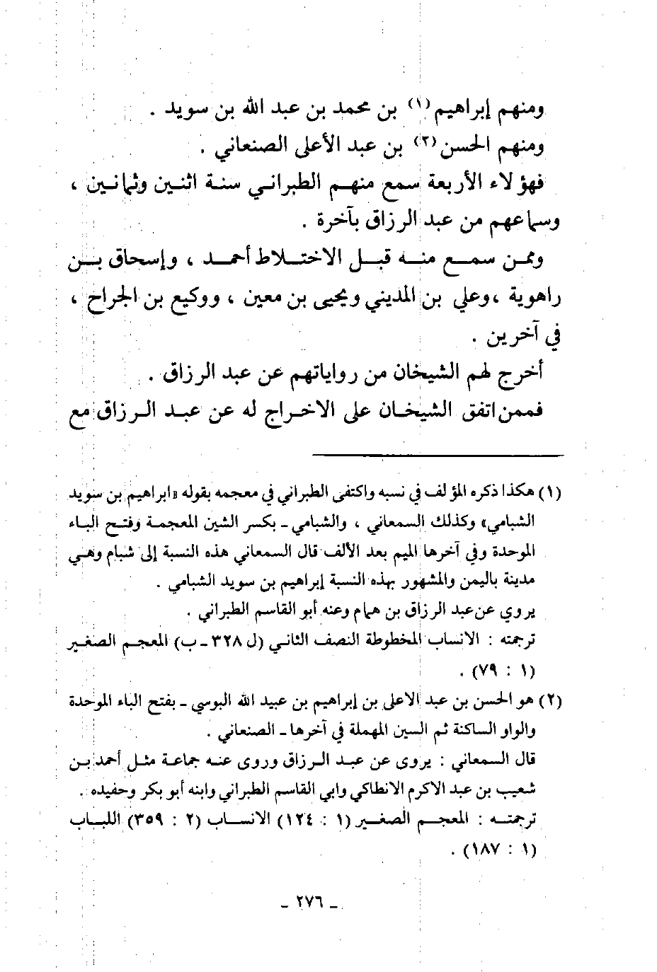 ومنهم إبراهيم بن محمد بن عبد الله بن سويد ومنهم الحسن بن عبد الأعلى الصنعاني فهؤلاء الأربعة سمع منهم الطبراني سنة اثنين وثمانين وسماعهم من عبد الرزاق بأخرة وممن سمع منه قبل الاختلاط أحمد وإسحاق بن راهويه وعلي بن المديني ويحيى بن معين ووكيع بن الجراح في آخرين آخرج لهم الشيخان من رواياتهم عن عبد الرزاق فممن اتفق الشيخان على الإخراج له عن عبد الرزاق مع