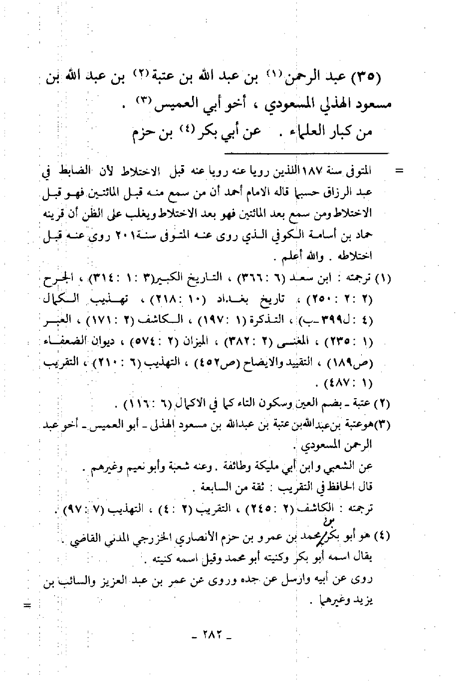 35 - عبد الرحمن بن عبد الله بن عتبة بن عبد الله بن مسعود الهذلي المسعودي أخو أبي العميس من كبار العلماء عن أبي بكر بن حزم