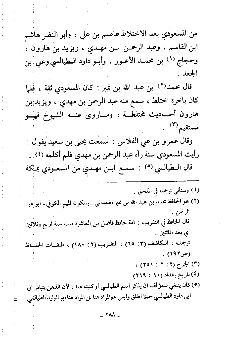من المسعودي بعد الاختلاط عاصم بن علي وأبو النضر هاشم بن القاسم وعبد الرحمن بن مهدي ويزيد بن هارون وحجاج بن محمد بن الأعور وأبو داود الطيالسي وعلي بن الجعد قال محمد بن عبد الله بن نمير كان المسعودي ثقة فلما كان بأخرة اختلط سمع منه عبد الرحمن بن مهدي ويزيد بن هارون أحاديث مختلطة وما روى عنه الشيوخ فهو مستقيم وقال عمرو بن علي الفلاس سمعت يحيى بن سعيد يقول رأيت المسعودي سنة رآه عبد الرحمن بن مهدي فلم أكلمه قال الطيالسي سمع بن مهدي من المسعودي بمكة