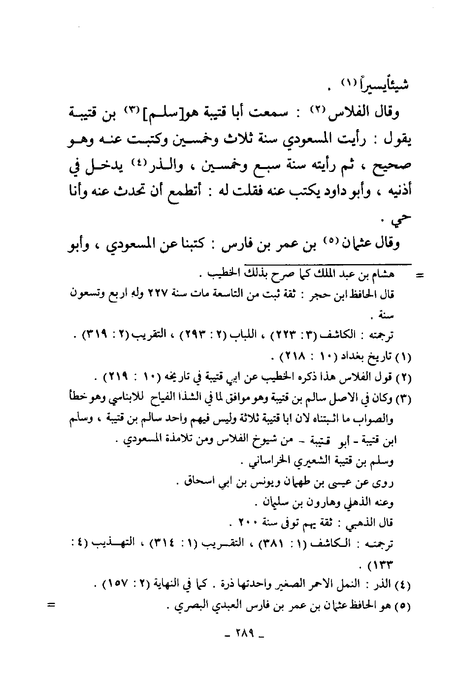 شيئا يسيرا وقال الفلاس سمعت أبا قتيبة هو سالم بن قتيبة يقول رأيت المسعودي سنة ثلاث وخمسين وكتبت عنه وهو صحيح ثم رأيته سنة سبع وخمسين والذر يدخل في أذنيه وأبو داود يكتب عنه فقلت له أتطمع أن تحدث عنه وأنا حي وقال عثمان بن عمر بن فارس كتبنا عن المسعودي وأبو