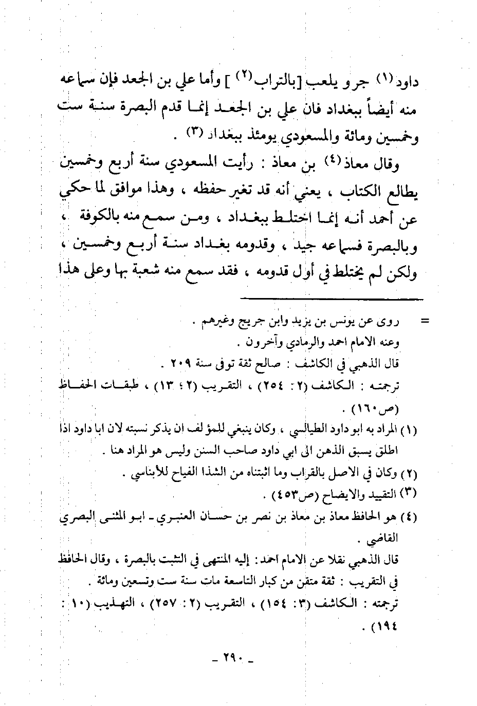 داود جرو يلعب بالقرب وأما علي بن الجعد فإن سماعه منه أيضا ببغداد فإن علي بن الجعد إنما قدم البصرة سنة ست وخمسين ومائة والمسعودي يومئذ ببغداد وقال معاذ بن معاذ رأيت المسعودي سنة أربع وخمسين يطالع الكتاب يعني أنه قد تغير حفظه وهذا موافق لما حكي عن أحمد أنه اختلط ببغداد ومن سمع منه بالكوفة وبالبصرة فسماعه جيد وقدومه بغداد سنة أربع وخمسين ولكن لم يختلط في أول قدومه فقد سمع منه شعبة بها وعلى هذا