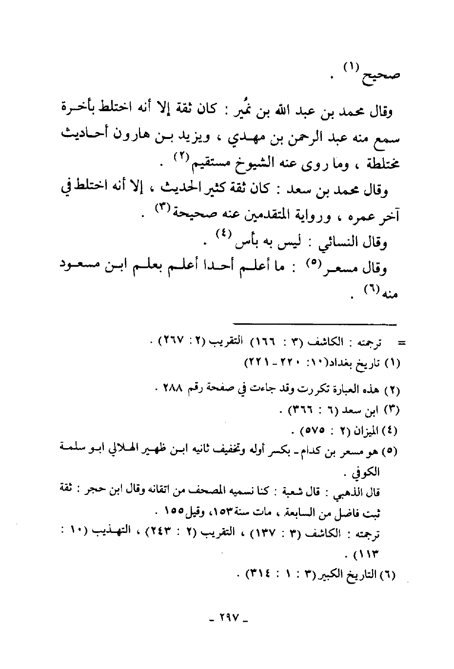 صحيح وقال محمد بن عبد الله بن نمير كان ثقة إلا أنه اختلط بأخرة سمع منه عبد الرحمن بن مهدي ويزيد بن هارون أحاديثه مختلطة وما روى عنه الشيوخ مستقيم وقال محمد بن سعد كان ثقة كثير الحديث إلا أنه اختلط في آخر عمره ورواية المتقدمين عنه صحيحة وقال النسائي ليس به بأس وقال مسعر ما أعلم أحد أعلم بعلم بن مسعود منه