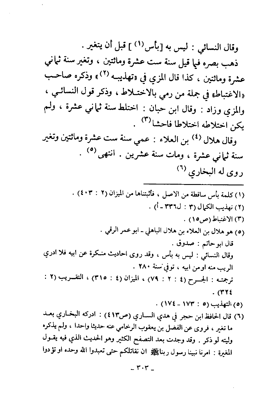 وقال النسائي ليس به بأس قبل أن يتغير ذهب بصره فيما قيل سنة ست عشرة ومئتين وتغير سنة ثمان عشرة ومئتين كذا قال المزي في تهذيبه وذكره صاحب الاغتباط في جملة من رمي بالاختلاط وذكر قول النسائي والمزي وزاد وقال بن حبان اختلط سنة ثمان عشرة ولم يكن اختلاطه اختلاطا فاحشا وقال هلال بن العلاء عمي سنة ست عشرة ومئتين وتغير سنة ثمان عشرة ومات سنة عشرين انتهى روى له البخاري