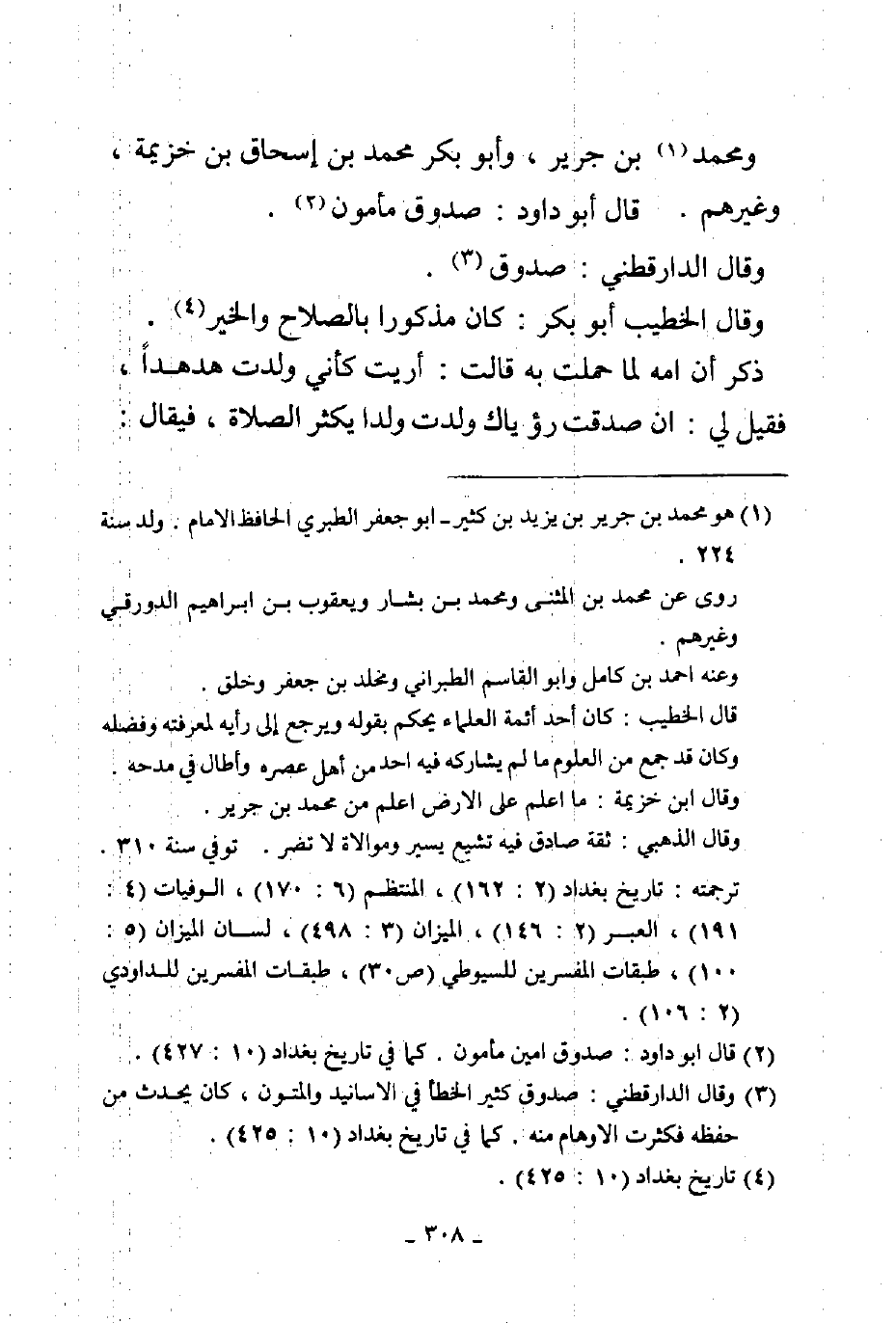 ومحمد بن جرير وأبو بكر محمد بن إسحاق بن خزيمة وغيرهم قال أبو داود صدوق مأمون وقال الدارقطني صدوق وقال الخطيب أبو بكر كان مذكورا بالصلاح والخير ذكر أن أمه لما حملت به قالت أريت كأني ولدت هدهدا فقيل لي إن صدقت رؤياك ولدت ولدا يكثر الصلاة فيقال