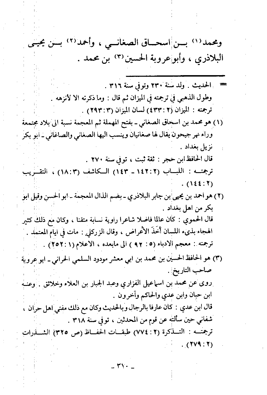 ومحمد بن إسحاق الصغاني وأحمد بن يحيى البلاذري وأبو عروبة الحسين بن محمد