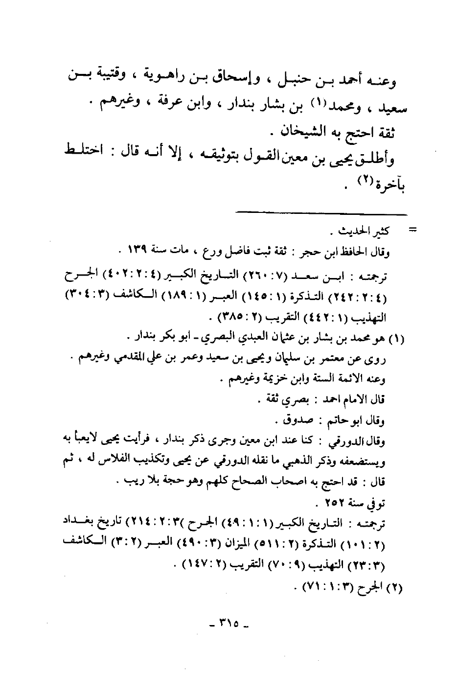 وعنه أحمد بن حنبل وإسحاق بن راهويه وقتيبة بن سعيد ومحمد بن بشار بندار وابن عرفة وغيرهم ثقة احتج به الشيخان وأطلق يحيى بن معين القول بتوثيقه إلا أنه قال اختلط بأخرة