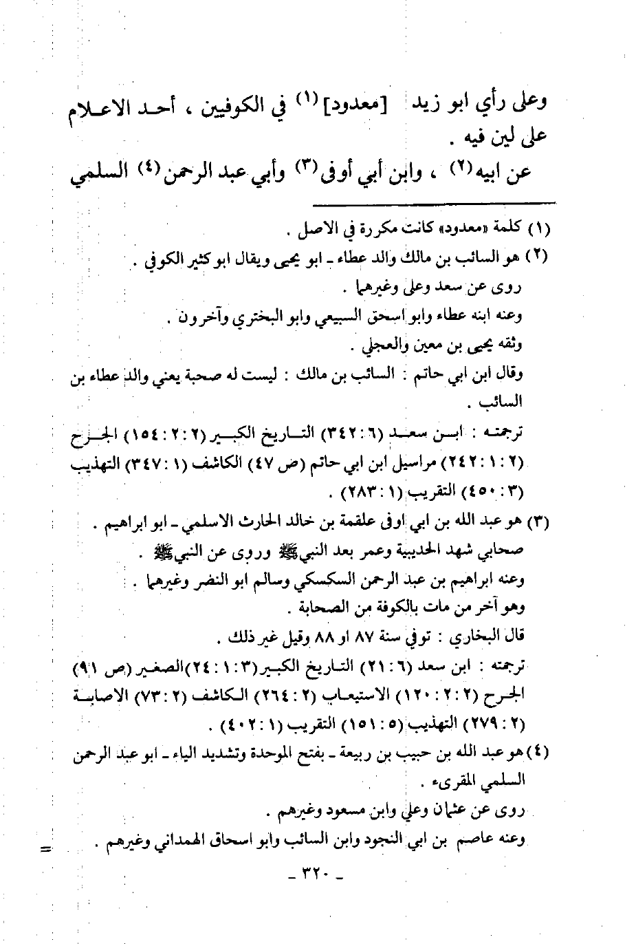 وعلي رأى أبي زيد معدود في الكوفيين أحد الأعلام على لين فيه عن أبيه وابن أبي أوفى وأبي عبد الرحمن السلمي