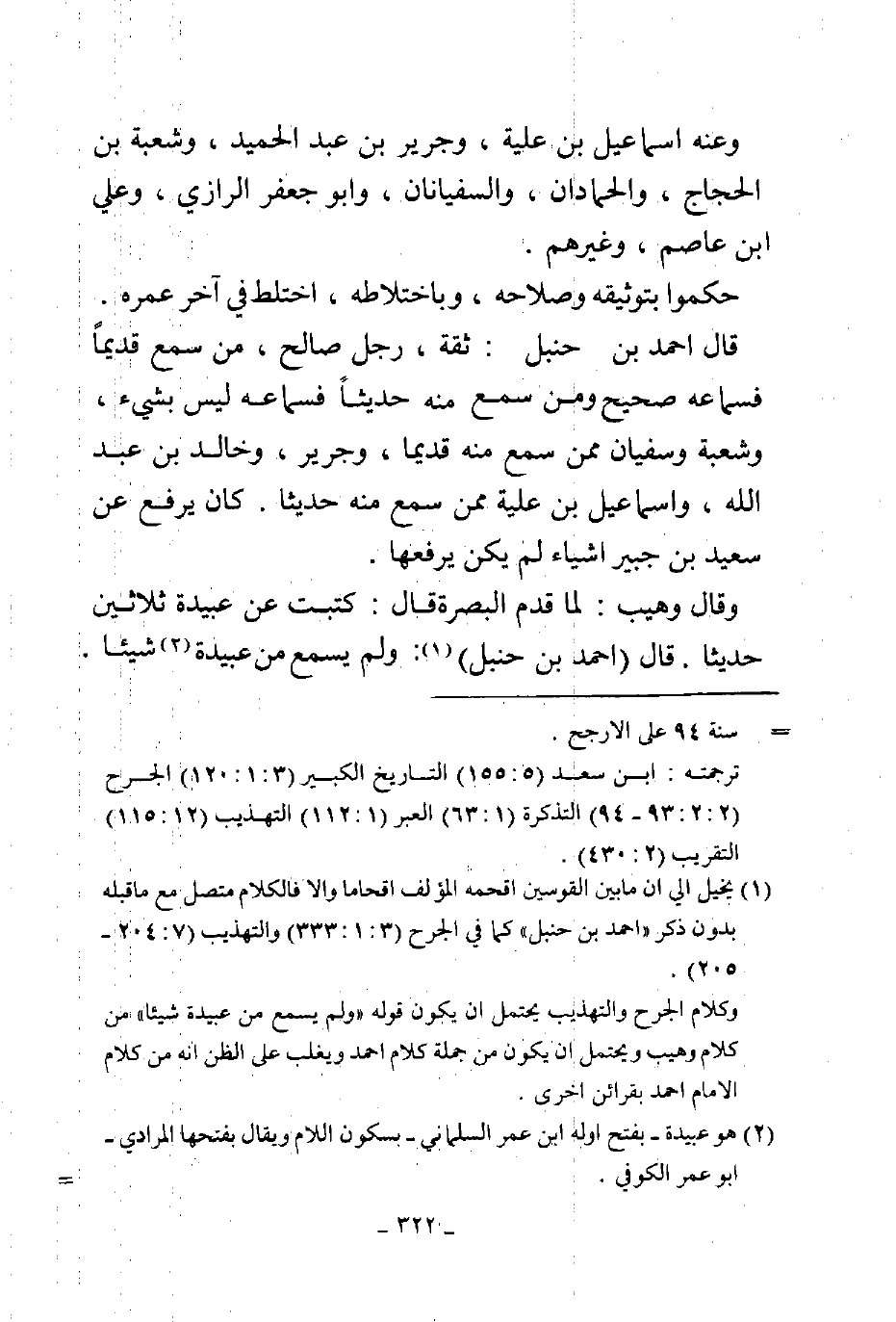 وعنه إسماعيل بن علية وجريرة بن عبد الحميد وشعبة بن الحجاج والحمادان والسفيانان وأبو جعفر الرازي وعلى بن عاصم وغيرهم حكموا بتوثيقه وصلاحه وباختلاطه اختلط في آخر عمره قال أحمد بن حنبل ثقة رجل صالح من سمع منه قديما فسماعه صحيح ومن سمع منه حديثا فسماعه ليس بشيء وشعبة وسفيان ممن سمع منه قديما وجرير وخالد بن عبد الله وإسماعيل بن علية ممن سمع منه حديثا كان يرفع عن سعيد بن جبير أشياء لم يكن يرفعها وقال وهيب لما قدم البصرة قال كتبت عن عبيدة ثلاثين حديثا قال أحمد بن حنبل ولم يسمع من عبيدة شيئا