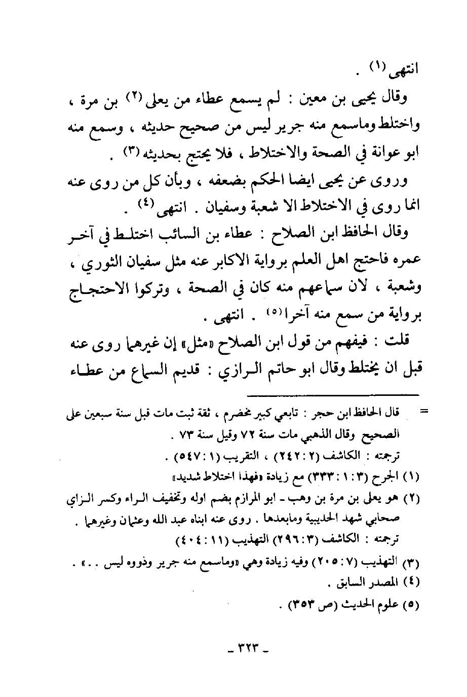 انتهى وقال يحيى بن معين لم يسمع عطاء من يعلى بن مرة واختلط وما سمع منه جرير ليس من صحيح حديثه وسمع منه أبو عوانة في الصحة والاختلاط فلا يحتج بحديثه وروى عن يحيى أيضا الحكم بضعفه وبأن كل من روى عنه إنما روى في الاختلاط إلا شعبة وسفيان انتهى وقال الحافظ بن الصلاح عطاء بن السائب اختلط في آخر عمره فاحتج أهل العلم برواية الأكابر عنه مثل سفيان الثوري وشعبة لأن سماعهم منه كان في الصحة وتركوا الاحتجاج برواية من سمع منه آخر انتهى قلت فيفهم من قول بن الصلاح مثل أن غيرهما روى عنه قبل أن يختلط وقال أبو حاتم الرازي قديم السماع من عطاء