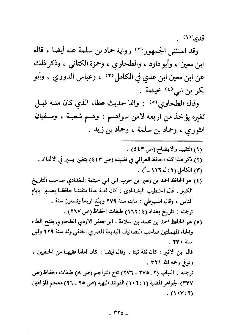 قديما وقد استثنى الجمهور رواية حماد بن سلمة عنه أيضا قاله بن معين وأبو داود والطحاوي وحمزة الكناني وذكر ذلك عن بن معين بن عدي في الكامل وعباس الدوري وأبي بكر بن أبي خيثمة وقال الطحاوي وإنما حديث عطاء الذي كان منه قبل تغيره يؤخذ من أربعة لا من سواهم وهم شعبة وسفيان الثوري وحماد بن سلمة وحماد بن زيد