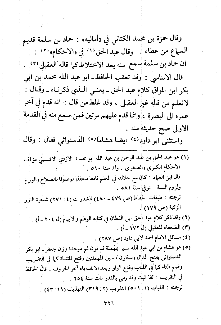 وقال حمزة بن محمد الكناني في أماليه حماد بن سلمة قديم السماع من عطاء وقال عبد الحق في الإحكام أن حماد بن سلمة سمع منه بعد الاختلاط كما قاله العقيلي قال الأبناسي وقد تعقب الحافظ أبو عبد الله محمد بن أبي بكر بن المواق كلام عبد الحق يعني الذي ذكرناه وقال لا نعلم من قاله غير العقيلي وقد غلط من قال أنه قدم في آخر عمره إلى البصرة وإنما قدم عليهم مرتين فمن سمع منه في القدمة الأولى صح حديثه منه واستثنى أبو داود أيضا هشاما الدستوائي فقال وقال