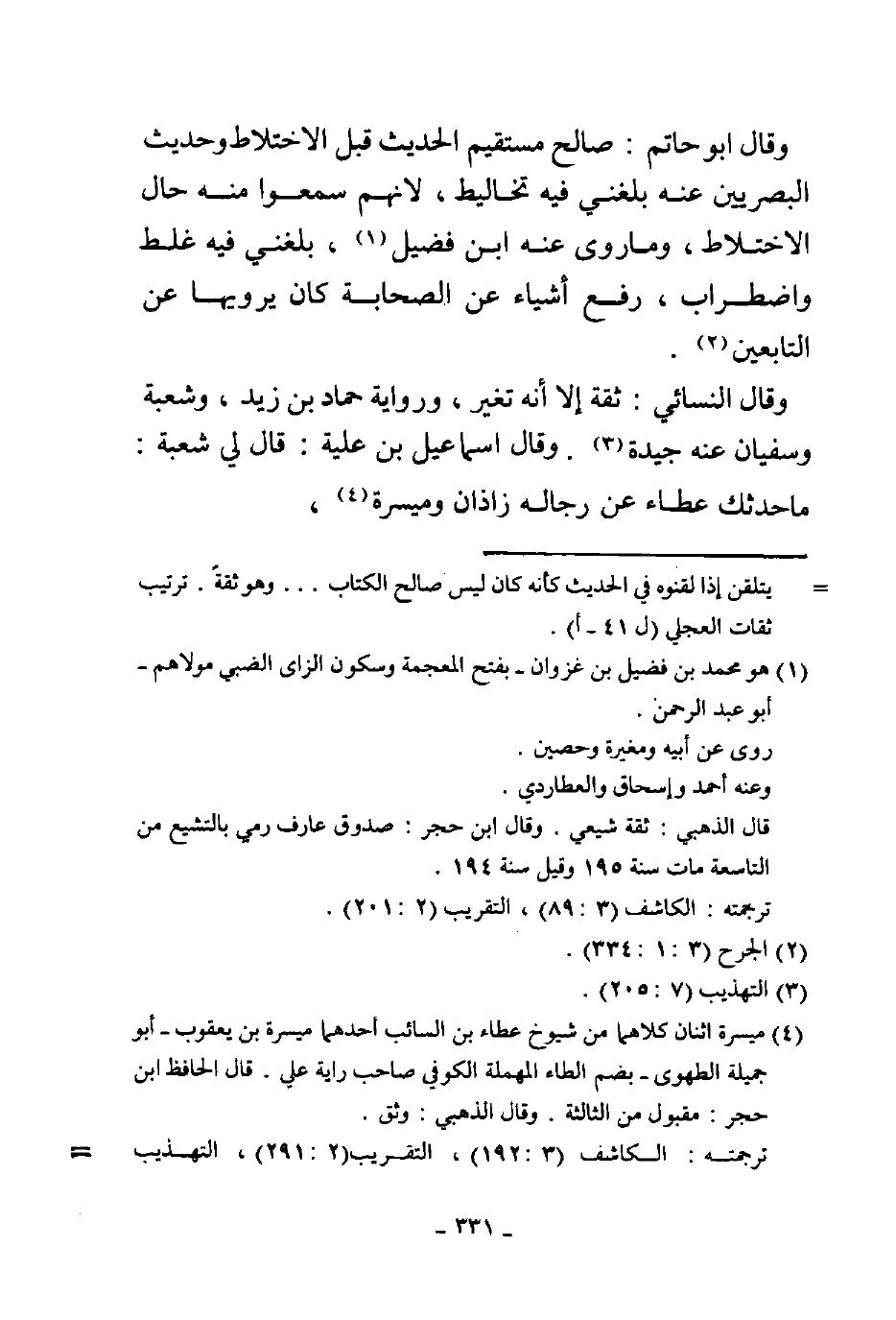 وقال أبو حاتم صالح مستقيم الحديث قبل الاختلاط وحديث البصريين عنه بلغني فيه تخاليط لأنهم سمعوا منه حال الاختلاط وما روى منه بن فضيل بلغني فيه غلط واضطراب رفع أشياء عن الصحابة كان يرويها عن التابعين وقال النسائي ثقة إلا أنه تغير ورواية حماد بن زيد وشعبة وسفيان عنه جيدة وقال إسماعيل بن علية قال لي شعبة ما حدثك عطاء عن رجاله زاذان وميسرة