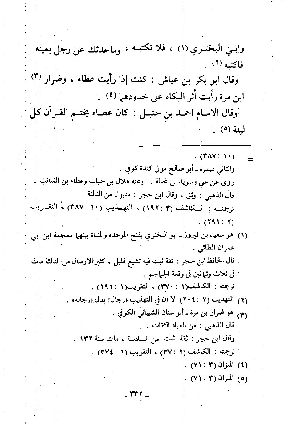 وأبي البختري فلا تكتبه وما حدثك عن رجل بعينه فاكتبه وقال أبو بكر بن عياش كنت إذا رأيت عطاء وضرار بن مرة رأيت أثر البكاء على خدودهما وقال الإمام أحمد بن حنبل كان عطاء يختم القرآن كل ليلة
