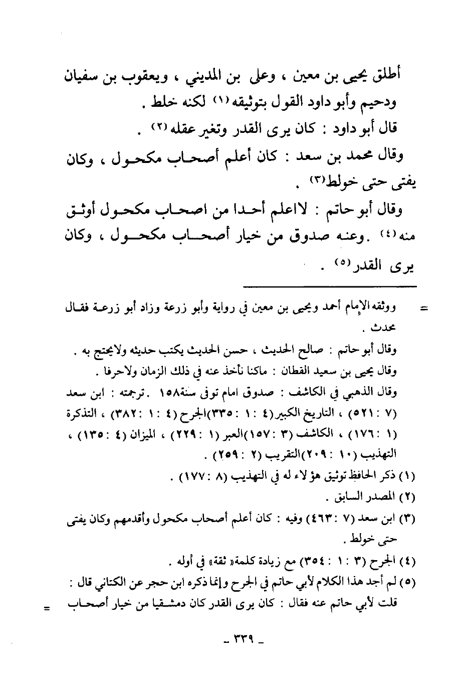 أطلق يحيى بن معين وعلى بن المديني ويعقوب بن سفيان ودحيم وأبو داود القول بتوثيقه لكنه خلط قال أبو داود كان يرى القدر وتغير عقله وقال محمد بن سعد كان أعلم أصحاب مكحول وكان يفتي حتى خولط وقال أبو حاتم لا أعلم أحدا من أصحاب مكحول أوثق منه وعنه صدوق من خيار أصحاب مكحول وكان يرى القدر