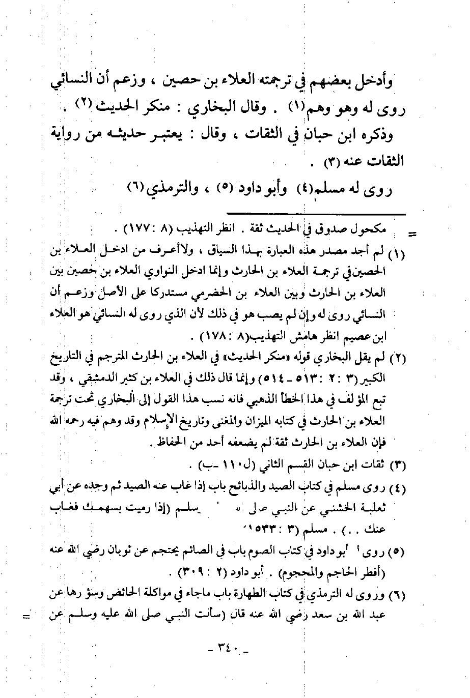 وأدخل بعضهم في ترجمته العلاء بن الحصين وزعم أن النسائي روى له وهو وهم وقال البخاري منكر الحديث وذكره بن حبان في الثقات وقال يعتبر حديثه من رواية الثقات عنه روى له مسلم وأبو داود والترمذي