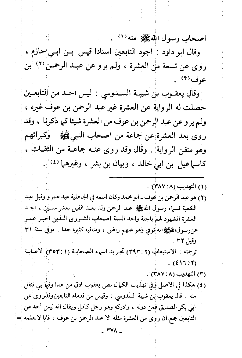 أصحاب رسول الله صلى الله عليه وسلم منه وقال أبو داود أجود التابعين إسنادا قيس بن أبي حازم روى عن تسعة من العشرة ولم يرو عن عبد الرحمن بن عوف وقال يعقوب بن شيبة السدوسي ليس أحد من التابعين حصلت له الرواية عن العشرة غير عبد الرحمن بن عوف غيره ولم يرو عن عبد الرحمن بن عوف من العشرة شيئا كما ذكرنا وقد روى بعد العشرة عن جماعة من أصحاب النبي صلى الله عليه وسلم وكبرائهم وهو متقن الرواية قال وقد روى عنه جماعة من الثقات كإسماعيل بن أبي خالد وبيان بن بشر وغيرهما