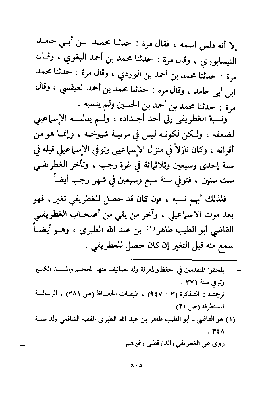 إلا أنه دلس اسمه فقال مرة حدثنا محمد بن أبي حامد النيسابوري وقال مرة حدثنا محمد بن أحمد البغوي وقال مرة ثنا محمد بن أحمد بن الوردي وقال مرة ثنا محمد بن أبي حامد وقال مرة ثنا محمد بن أحمد العبقي وقال مرة محمد بن أحمد بن الحسين ولم ينسبه ونسبة الغطريفي إلى أحد أجداده ولم يدلسه الإسماعيلي لضعفه ولكن لكونه ليس في مرتبة شيوخه وإنما هو من أقرانه وكان نازلا في منزل الإسماعيلي وتوفي الإسماعيلي قبله في سنة إحدى وسبعين وثلاثمائة في غرة رجب وتأخر الغطريفي ست سنين فتوفى سنة سبع وسبعين في شهر رجب أيضا فلذلك أبهم نسبه فإن كان قد حصل للغطريفي تغير فهو بعد موت الإسماعيلي وآخر من بقى من أصحاب الغطريفي القاضي أبو الطيب طاهر بن عبد الله الطبري وهو أيضا سمع منه قبل إن كان حصل للغطريفي