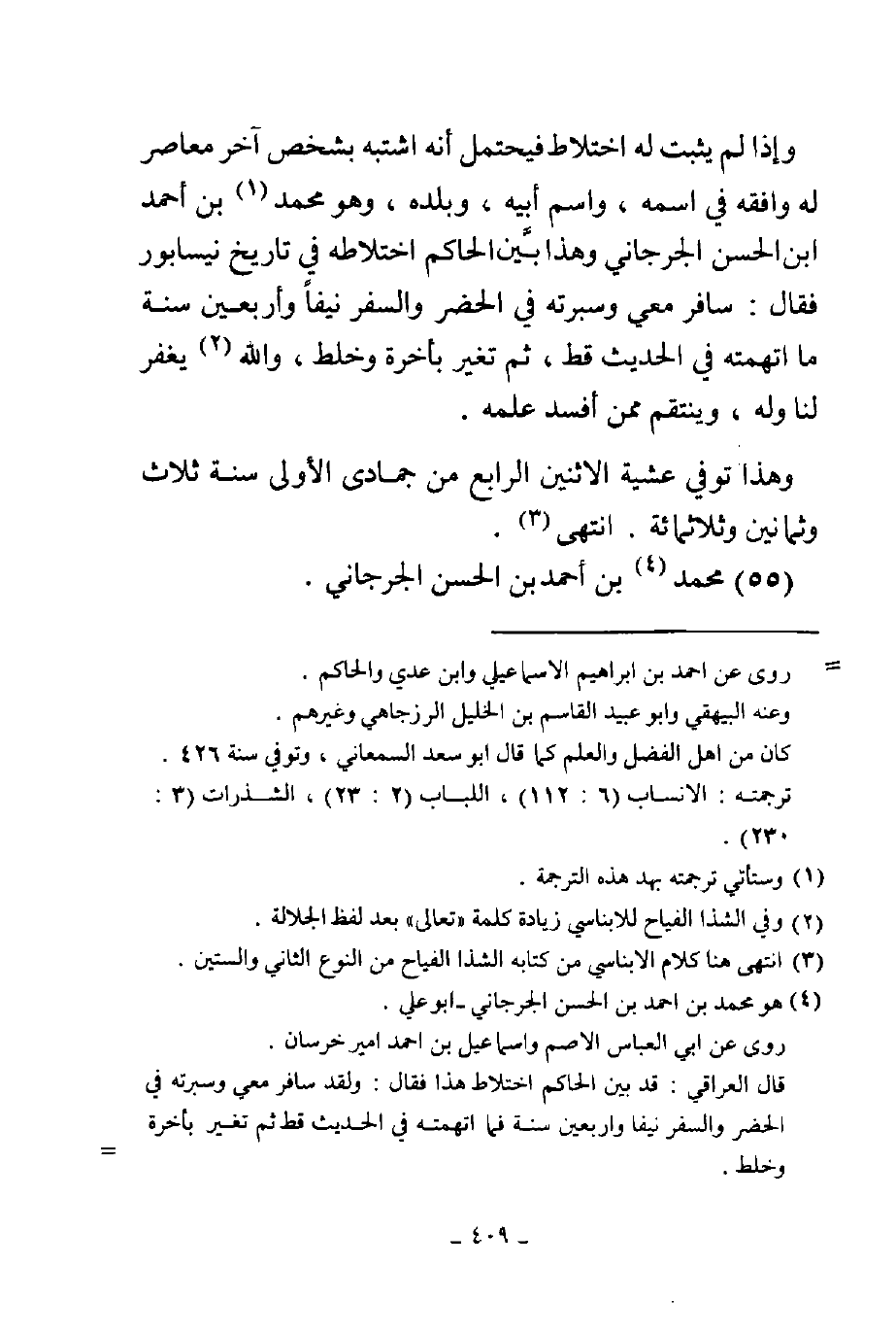 وإذا لم يثبت له اختلاط فيحتمل أنه اشتبه بشخص آخر معاصر له وافقه في اسمه واسم أبيه وبلده وهو محمد بن أحمد بن الحسن الجرجاني وهذا بين الحاكم اختلاطه في تاريخ نيسابور فقال سافر معي وسبرته في الحضر والسفر نيفا وأربعين سنة ما اتهمته في الحديث قط ثم تغير بأخرة وخلط والله يغفر لنا وله وينتقم ممن أفسد علمه وهذا توفي عشية الإثنين الرابع من جمادي الأولى سنة ثلاث وثمانين وثلاثمائة انتهى