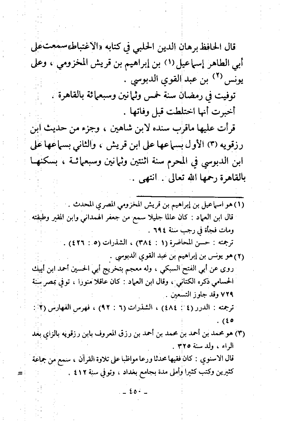 قال الحافظ برهان الدين الحلبي في كتابه الاغتباط سمعت علي أبي الطاهر إسماعيل بن إبراهيم بن قريش المخزومي وعلى يونس بن عبد القوي الدبوسي توفيت في رمضان سنة خمس وثمانين وسبعمائة بالقاهرة أخبرت أنها اختلطت قبل وفاتها قرأت عليها ما قرب سنده لابن شاهين وجزءا من حديث بن رزقويه الأول بسماعها على بن قريش والثاني بسماعها على بن الدبوسي في المحرم سنة اثنتين وثمانين وسبعمائة بسكنها بالقاهرة رحمها الله تعالى. انتهى