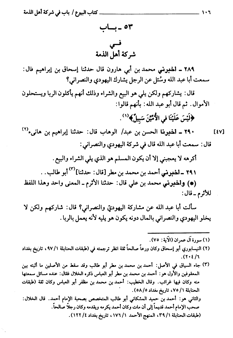 291 - أَخْبَرَنِي أحمد بن محمد بن مطر وأبو طالب، وأخبرني محمد بن علي، قَالَ: حَدَّثَنَا الأثرم، المعنى واحد، وهذا لفظ الأثرم، قَالَ: سألت أبا عبد الله عن مشاركة اليهودي والنصراني؟ قَالَ: يشاركهم، ولكن لا يخلو اليهودي والنصراني بالمال دونه، يكون هو يليه لأنه يعمل بالربا