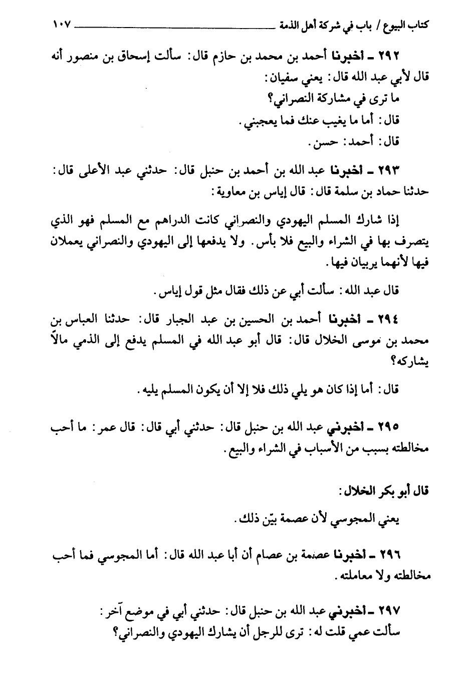 297 - أَخْبَرَنِي عبيد الله بن حنبل، قَالَ: حَدَّثَنِي أبي، وفي موضع آخر: سألت عمي، قلت له: ترى للرجل أن يشارك اليهودي والنصراني؟