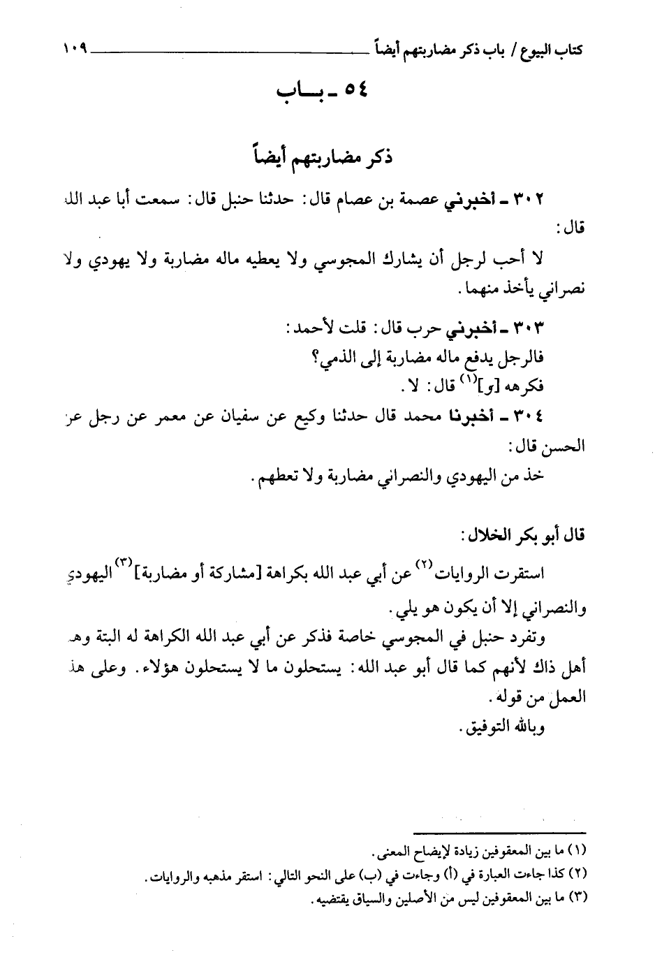 302 - أَخْبَرَنِي عصمة بن عصام، قَالَ: حَدَّثَنَا حنبل، قَالَ: سمعت أبا عبد الله، قَالَ: لا أحب لرجل أن يشارك المجوسي، ولا يعطيه ماله فيضاربه، ولا يهودي، ولا نصراني يأخذ منهما