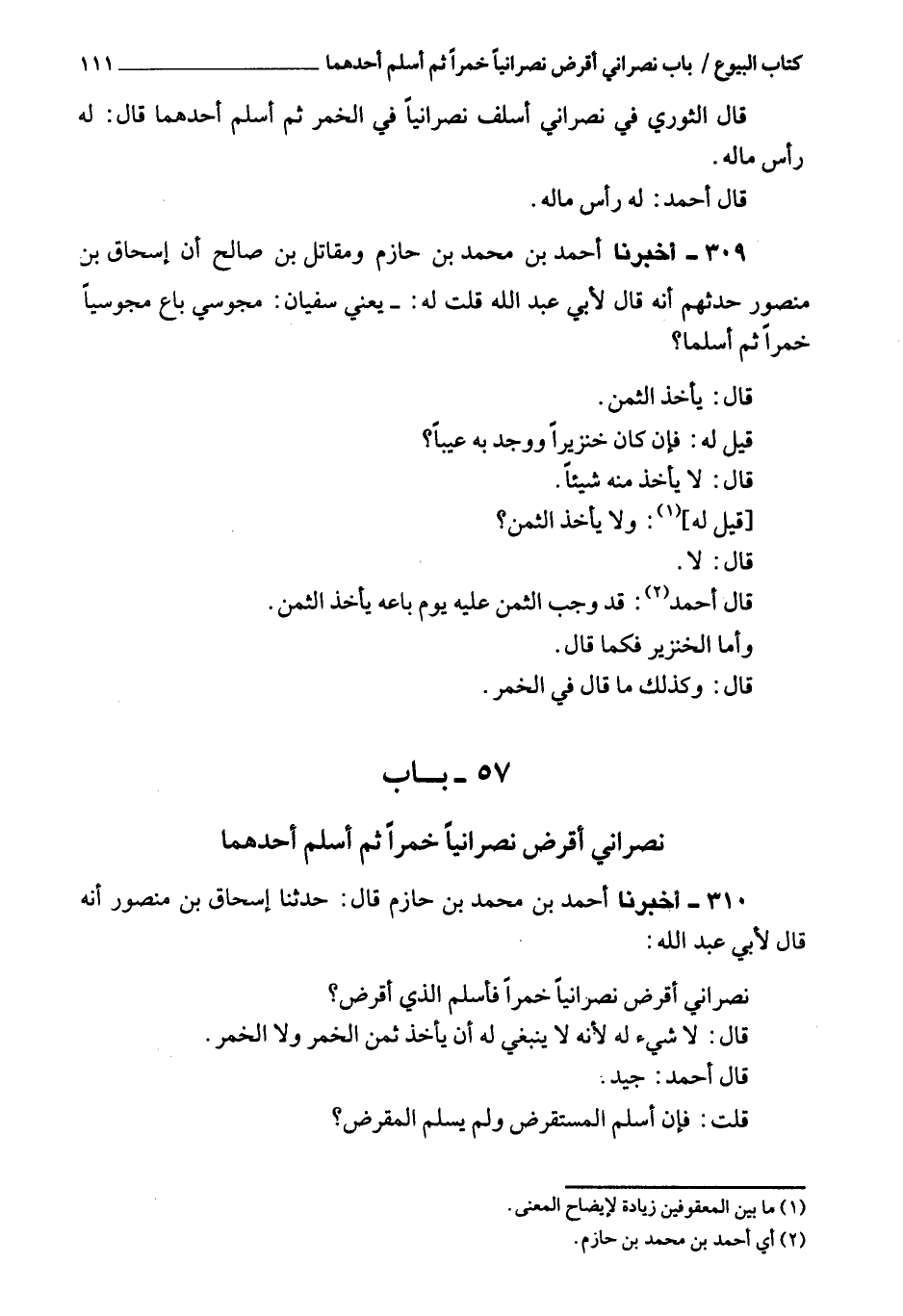 309 - أَخْبَرَنَا أحمد بن محمد بن حازم، ومقاتل بن صالح، أن إسحاق بن منصور حدثهم، أنه قَالَ لأبي عبد الله: قلت له، يعني: سفيان: مجوسي باع مجوسيا خمرا، ثم أسلم؟ قَالَ: يأخذ الثمن.