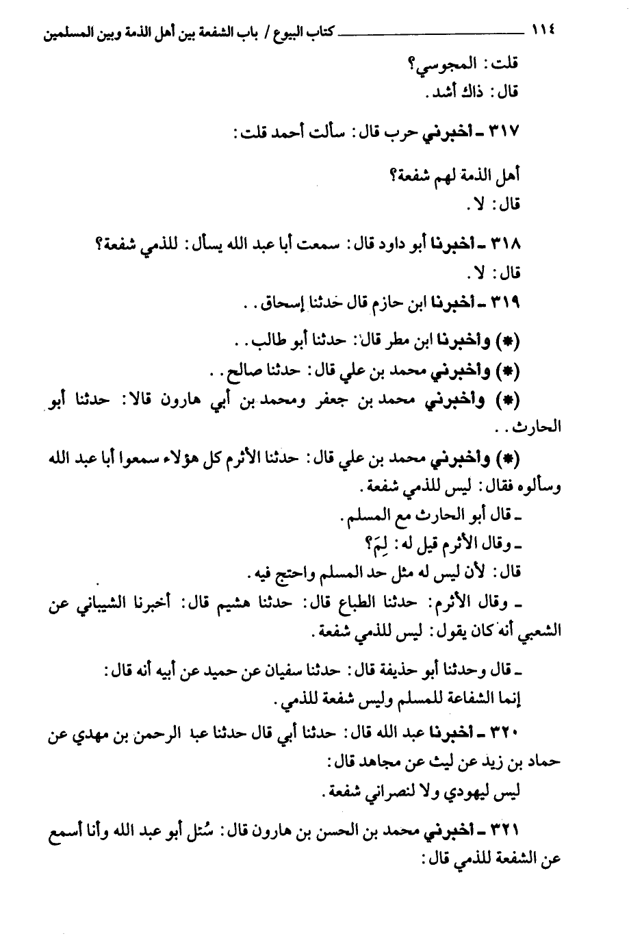 319 - أَخْبَرَنَا ابن حازم، قَالَ: حَدَّثَنَا إسحاق، وأخبرنا ابن مطر، قَالَ: حَدَّثَنَا أبو طالب، وأخبرني محمد بن علي، قَالَ: حَدَّثَنَا صالح؟ وأخبرنا محمد ابن جعفر، ومحمد بن أبي هارون، قالا: حَدَّثَنَا أبو الحارث، وأخبرني محمد بن علي، قَالَ: حَدَّثَنَا الأثرم، كل هؤلاء سمعوا أبا عبد الله، وسألوه، فقال: ليس للذمي شفعة.
