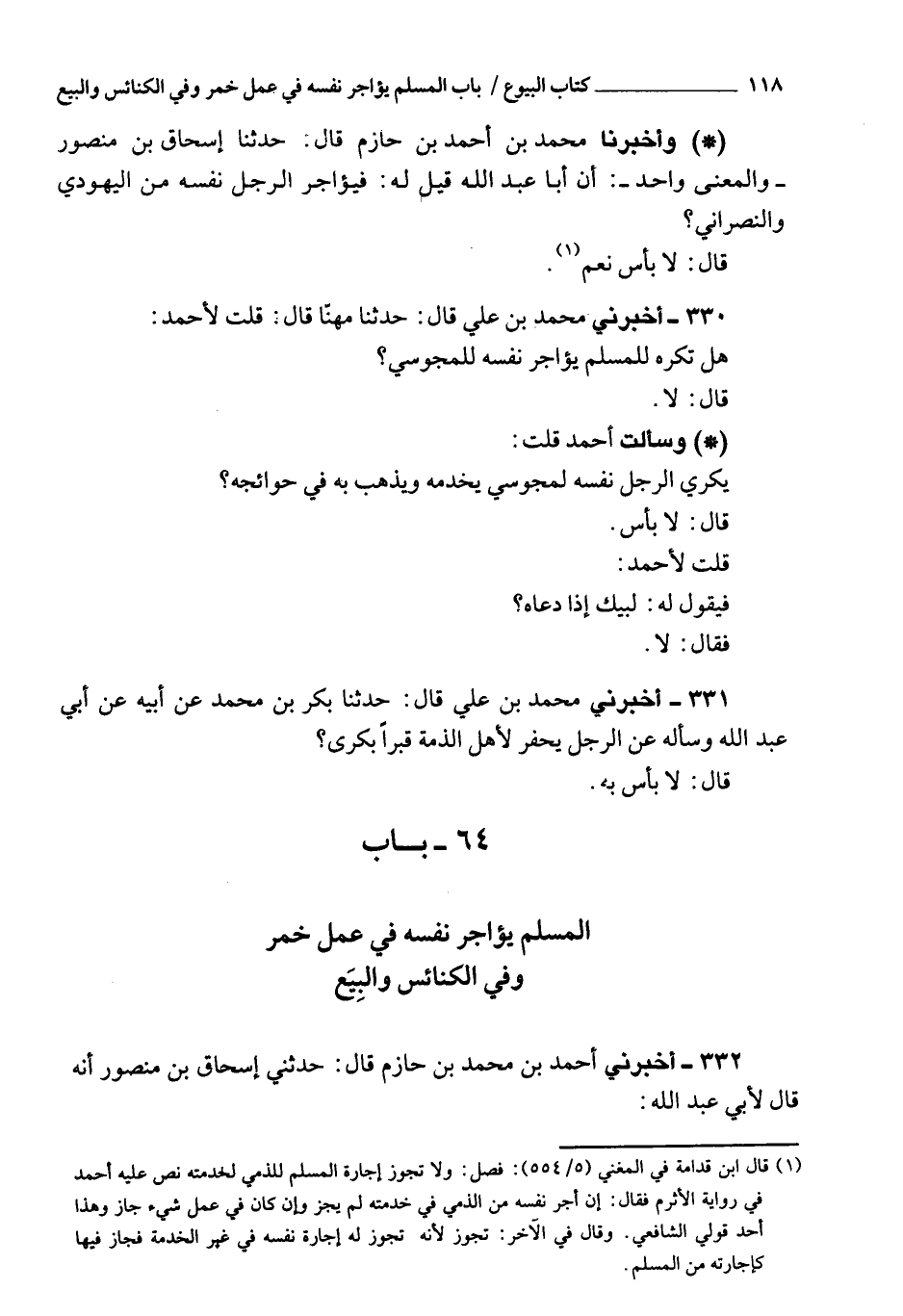 330 - أَخْبَرَنَا محمد بن علي، قَالَ: حَدَّثَنَا مهنا، قَالَ: قلت لأحمد: هل تكره للمسلم أن يؤجر نفسه للمجوسي؟ قَالَ: لا.