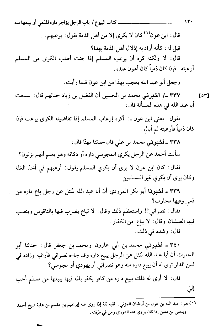 338 - أَخْبَرَنِي محمد بن علي، قَالَ: حَدَّثَنَا مهنا، قَالَ: سألت أحمد عن رجل يكري المجوس داره، أو دكانه، وهو يعلم أنهم يزنون؟ فقال: كان ابن عون لا يرى أن يكرى المسلم.