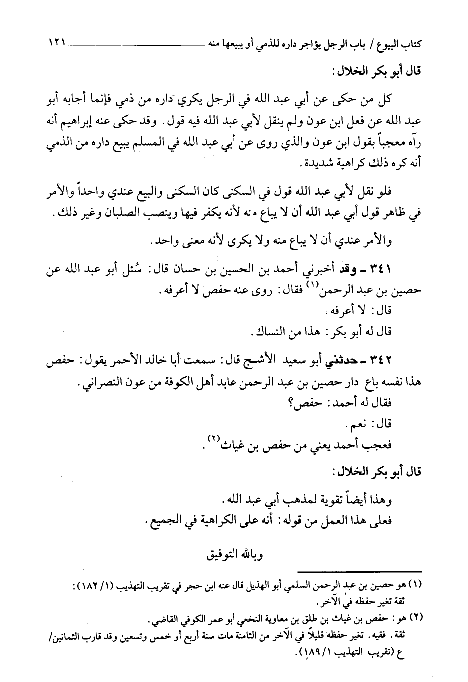 فعجب أحمد يعجب، يعني: من حفص بن غياث، قَالَ أبو بكر الخلال: وهذا أيضا تقوية لمذهب أبي عبد الله، فعلى هذا العمل من قوله، أنه على الكراهية في الجميع، وبالله التوفيق