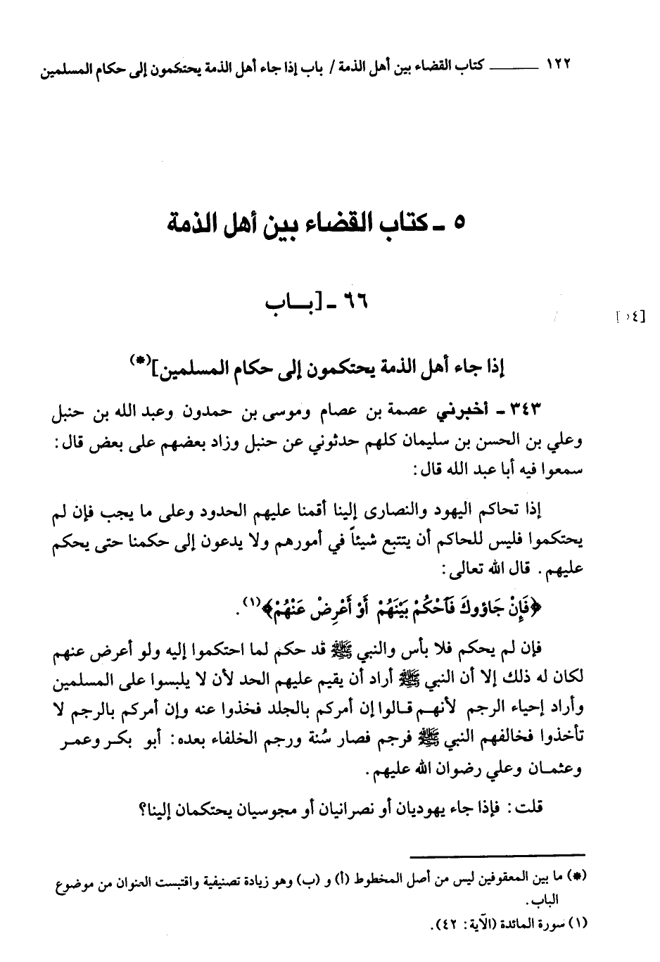 343 - أَخْبَرَنِي عصمة بن عصام، وموسى بن حمدون، وعبيد الله بن حنبل، وعلي بن الحسن بن سليمان، كلهم حدثوني عن حنبل، وزاد بعضهم عن بعض، قَالَ: سمعت أبا عبد الله، قَالَ: إذا تحاكم اليهود والنصارى إلينا، أقمنا عليهم الحدود على ما يجب، فإن لم يحتكموا فليس للحاكم أن يتبع شيئا من أمورهم، ولا يدعون إلى حكمنا حتى يحكم عليهم.