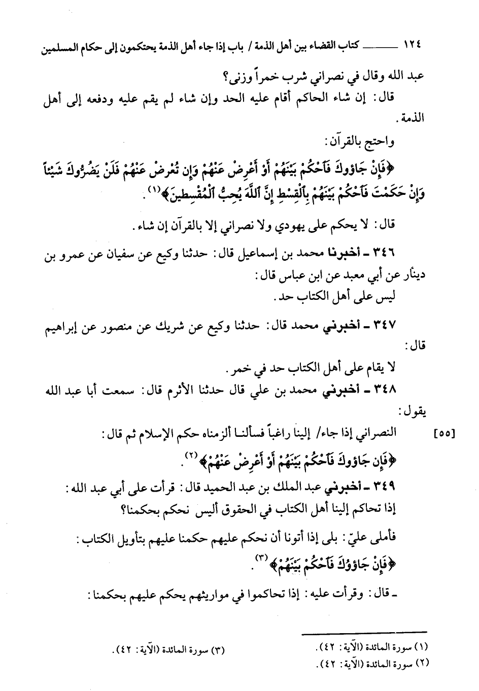 348 - أَخْبَرَنِي محمد بن علي، قَالَ: حَدَّثَنَا الأثرم، قَالَ: سمعت أبا عبد الله يقول في النصراني، إذا جاء إلينا راغبا فسألنا: ألزمناه حكم الإسلام، ثم تلا: {فَإِنْ جَاءُوكَ فَاحْكُمْ بَيْنَهُمْ أَوْ أَعْرِضْ عَنْهُمْ} [المائدة: 42]
