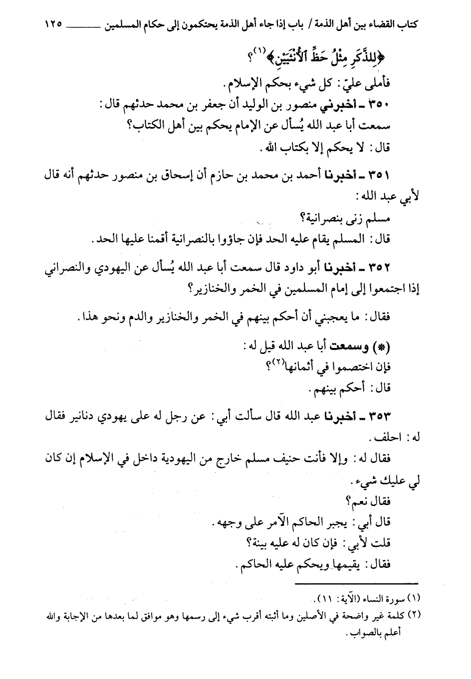 350 - أَخْبَرَنِي منصور بن الوليد، أن جعفر بن محمد حدثهم، قَالَ: سمعت أبا عبد الله سئل عن الإمام، يحكم بين أهل الكتاب؟ قَالَ: لا يحكم إلا بكتاب الله