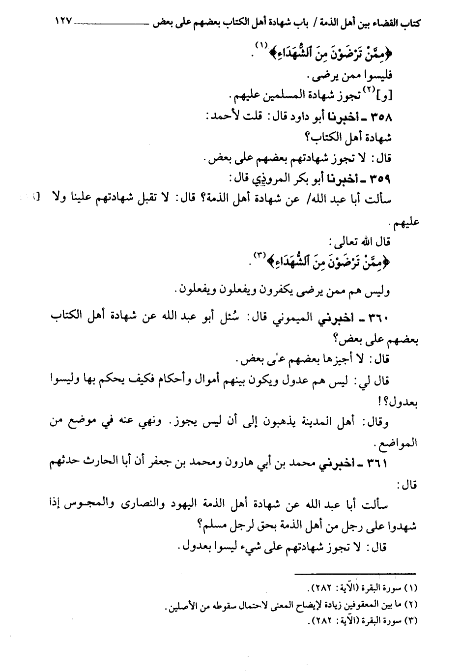 359 - أَخْبَرَنَا أبو بكر المروذي، قَالَ: سألت أبا عبد الله عن شهادة أهل الذمة، قَالَ: لا تقبل شهادتهم علينا ولا عليهم، قَالَ الله، تعالى: {مِمَّنْ تَرْضَوْنَ مِنَ الشُّهَدَاءِ} [البقرة: 282] وليس هم ممن نرضى؛ يكفرون ويفعلون ويفعلون