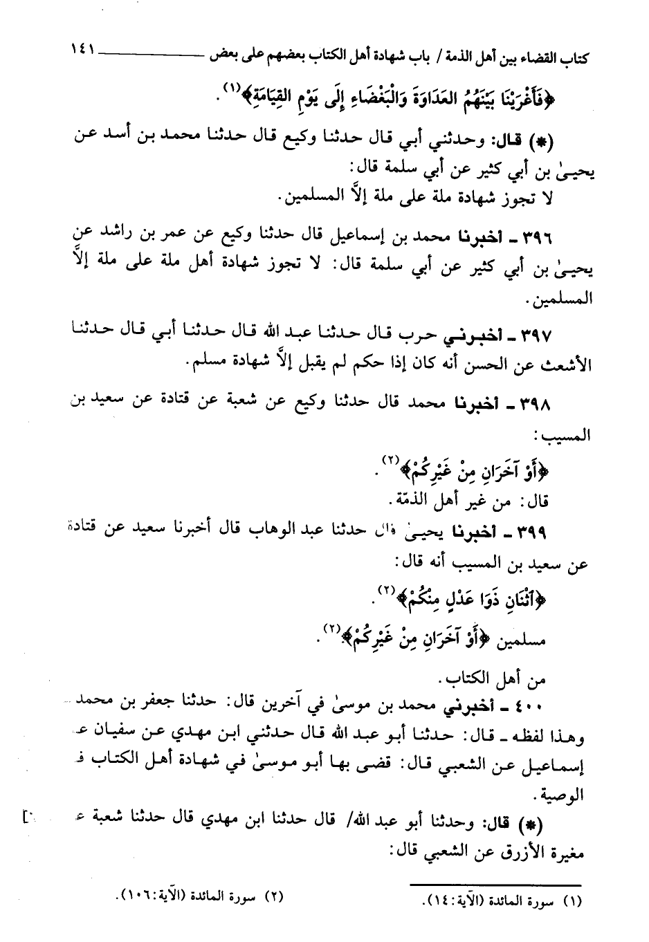 399 - أَخْبَرَنَا يحيى، قَالَ: حَدَّثَنَا عبد الوهاب، قَالَ: أَخْبَرَنَا سعيد، عن قتادة، عن سعيد بن المسيب، أنه قَالَ: {اثْنَانِ ذَوَا عَدْلٍ مِنْكُمْ} [المائدة: 106] : مسلمان، {أَوْ آخَرَانِ مِنْ غَيْرِكُمْ} [المائدة: 106] : من أهل الكتاب