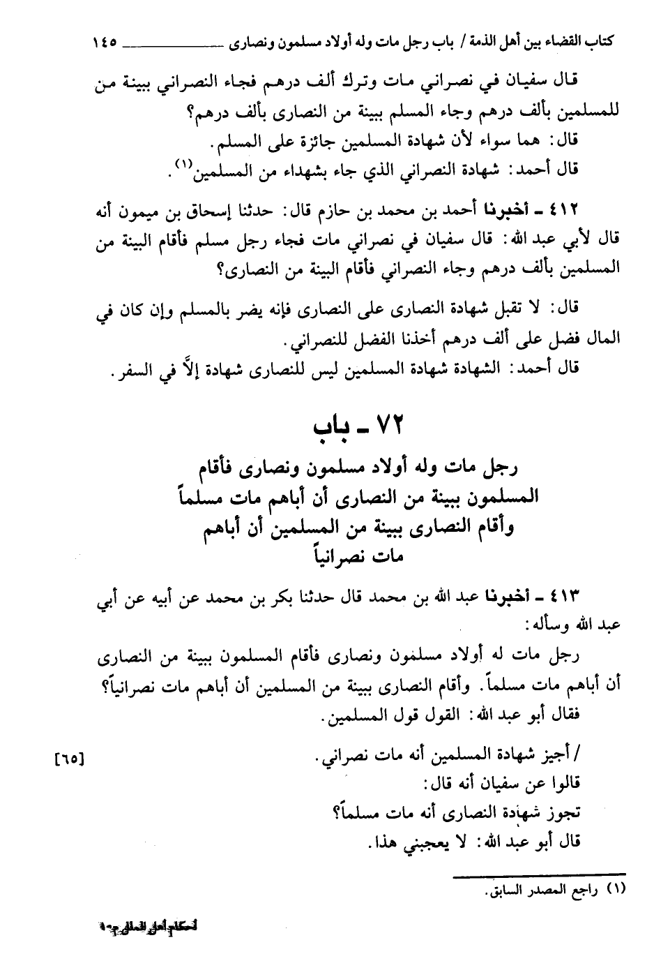 412 - أَخْبَرَنَا أحمد بن محمد بن حازم، قَالَ: حَدَّثَنَا إسحاق بن ميمون، أنه قَالَ لأبي عبد الله: قَالَ سفيان في نصراني مات، فجاء رجل مسلم فأقام البينة من المسلمين بألف درهم، وجاء النصراني فأقام البينة من النصارى، قَالَ: لا تقبل شهادة النصارى على النصارى، فإنه يضر بالمسلمين، فإن كان في المال فضل على ألف أخذنا الفضل للنصراني.