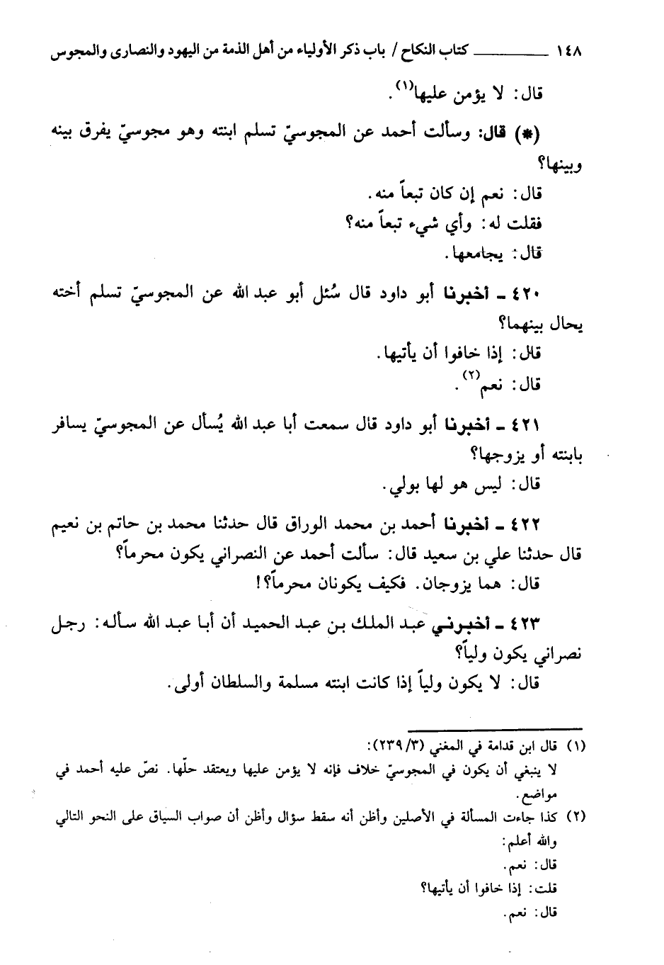 420 - أَخْبَرَنَا أبو داود، قَالَ: سئل أبو عبد الله عن المجوسي تسلم أخته، يحال بينهما؟ قَالَ: خافوا، يعني: أن يأتيها؟ قَالَ: نعم
