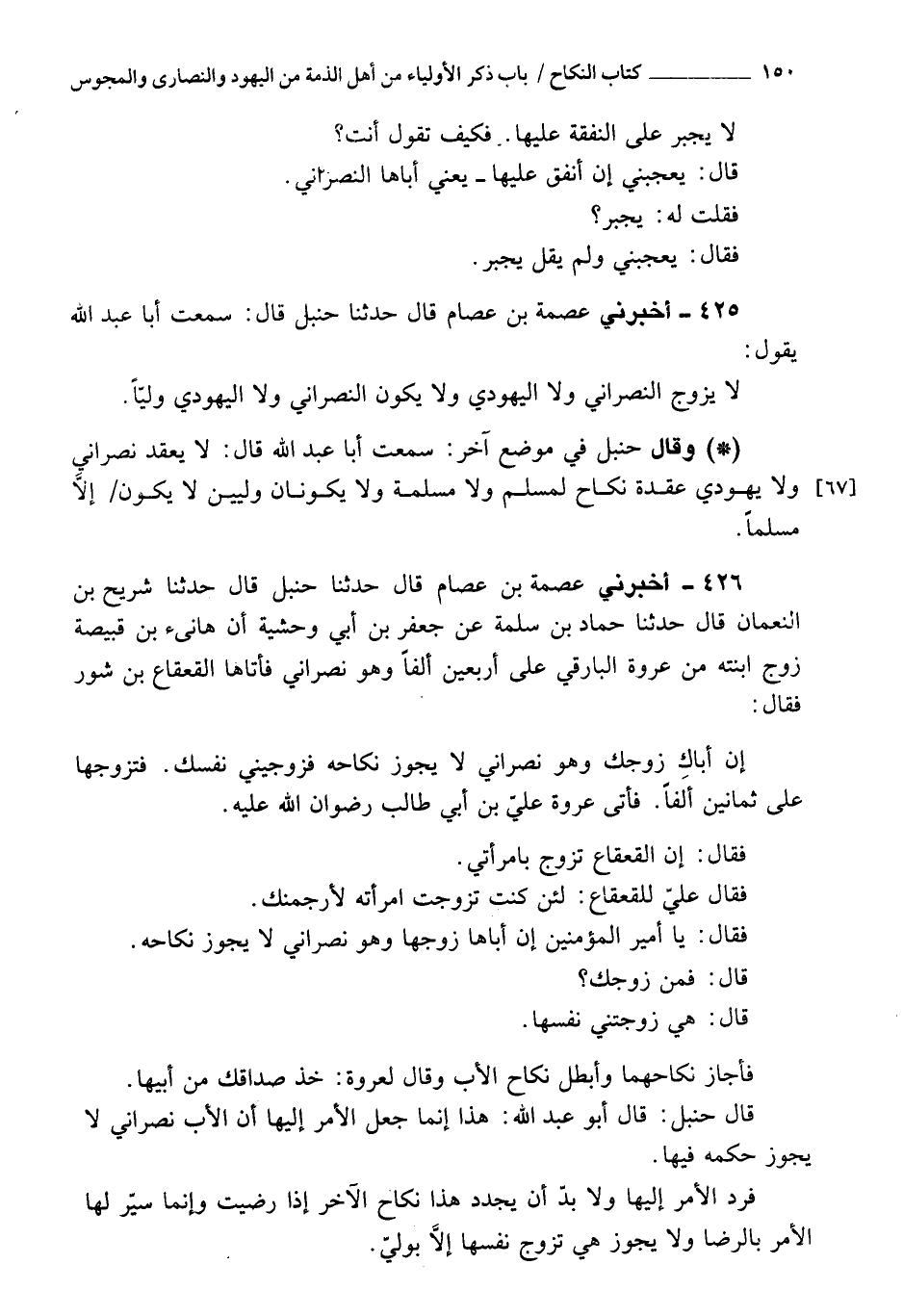 425 - أَخْبَرَنِي عصمة بن عصام، قَالَ: حَدَّثَنَا حنبل، قَالَ: سمعت أبا عبد الله، يقول: لا يزوج النصراني، ولا اليهودي.