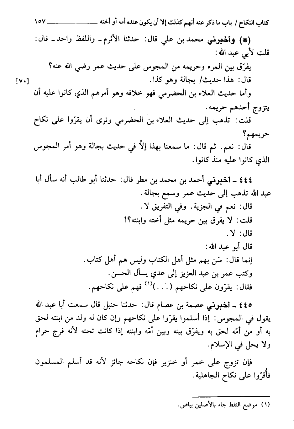 وأخبرني محمد بن علي، قَالَ: حَدَّثَنَا الأثرم، واللفظ واحد، قَالَ: قلت لأبي عبد الله: يفرق بين المرء وحريمه من المجوس، على حديث عمر، رَضِيَ اللَّهُ عَنْهُ؟ قَالَ: هذا حديث بجالة، هو كذا، وأما حَدَّثَنَا العلاء بن الحضرمي فهو خلافه، وهو أقرهم على الذي كانوا عليه إن تزوج أحدهم حريمه.