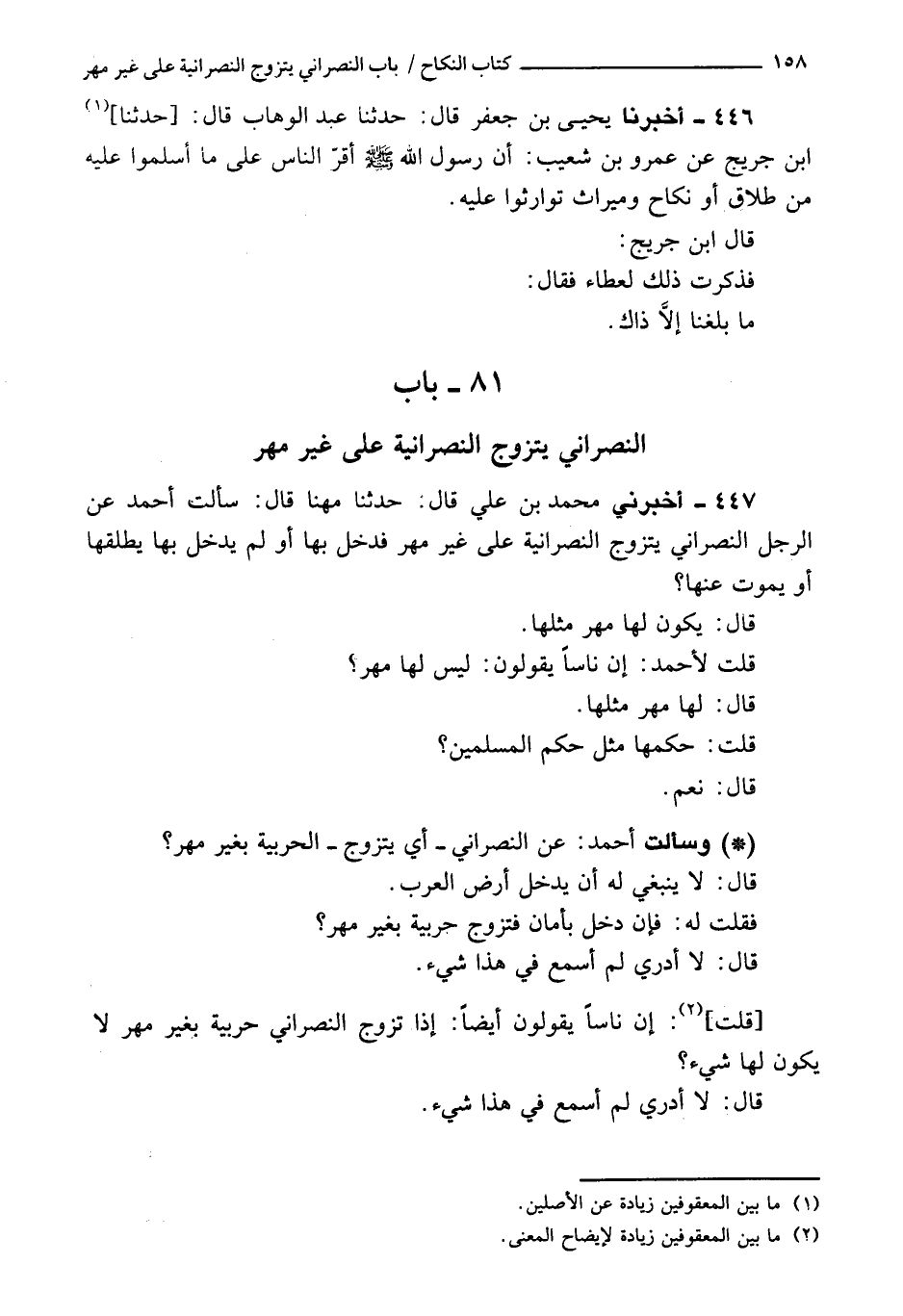 447 - أَخْبَرَنِي محمد بن علي، قَالَ: حَدَّثَنَا مهنا، قَالَ: سألت أحمد عن الرجل النصراني يتزوج النصرانية على غير مهر، فيدخل بها، أو لم يدخل بها فيطلقها، أو يموت عنها؟ ، قَالَ: يكون لها مهر مثلها.