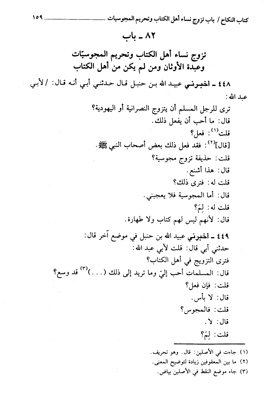 449 - أَخْبَرَنِي عبيد الله بن حنبل، في موضع آخر، قَالَ: حَدَّثَنِي أبي قَالَ: قلت لأبي عبد الله: فترى التزويج في أهل الكتاب؟ قَالَ: المسلمات أحب إلى ما تريد إلى ذلك، والله قد وسع.
