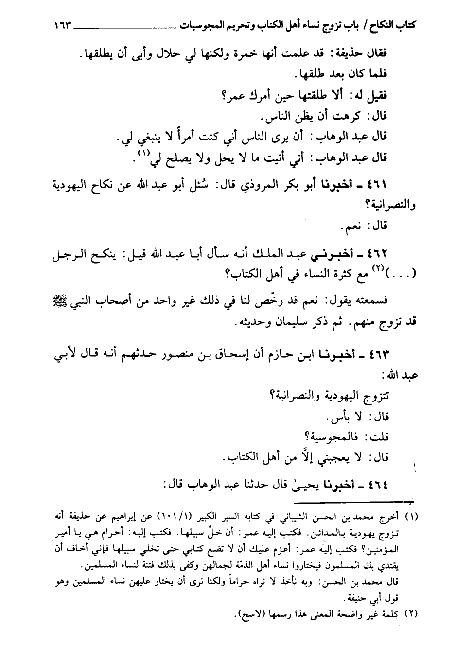 462 - أَخْبَرَنِي عبد الملك، أنه سأل أبا عبد الله: هل ينكح الرجل اليوم مع كثرة النساء، في أهل الكتاب؟ فسمعته يقول: نعم، رخص لنا في ذلك غير واحد من أصحاب النبي، صَلَّى اللَّهُ عَلَيْهِ وَسَلَّمَ، قد تزوج فيهم، ثم ذكر سلمان وحذيفة