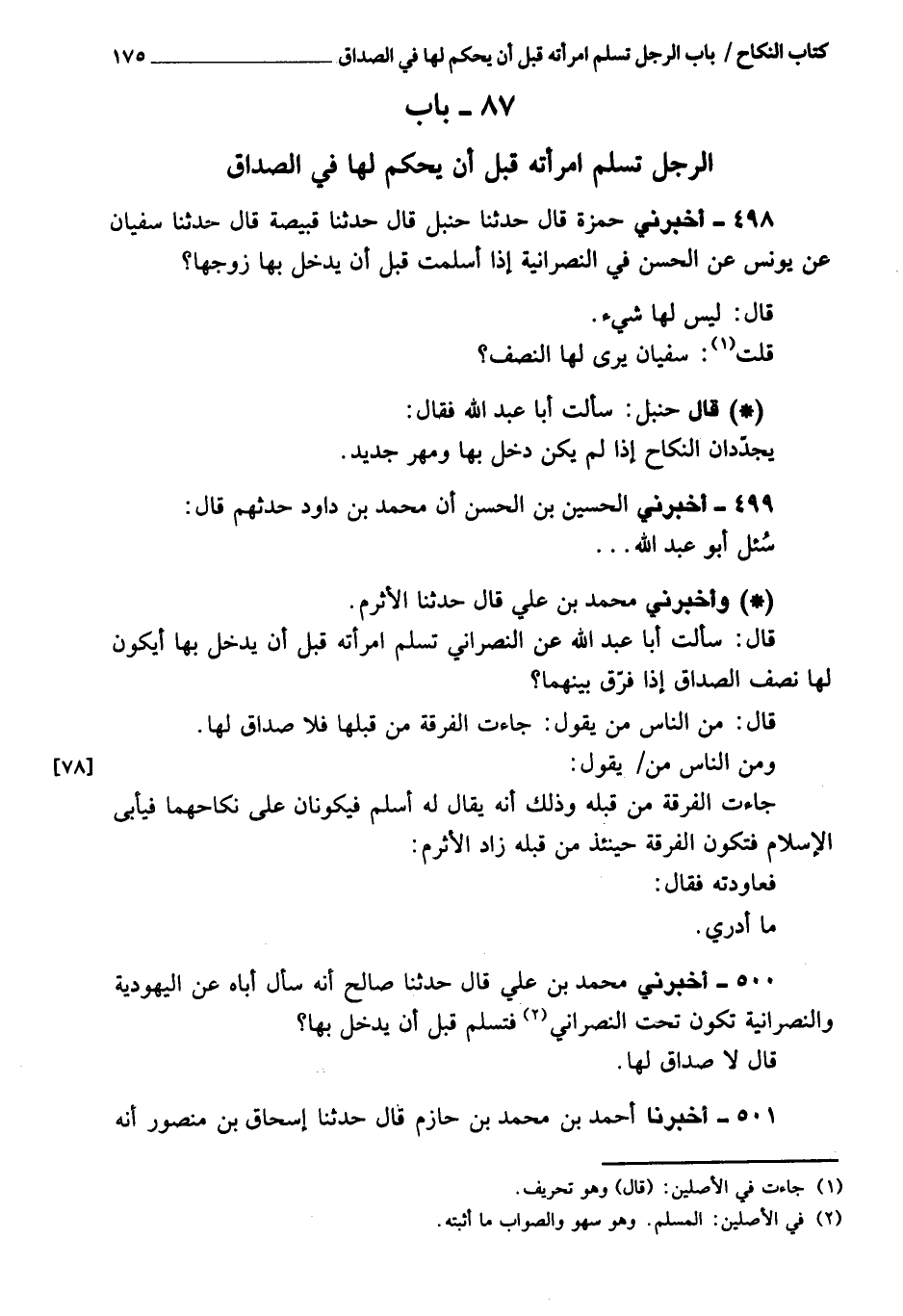 499 - أَخْبَرَنِي الحسين بن الحسن، أن محمدا بن داود حدثهم، قَالَ: سئل أبو عبد الله، وأخبرني محمد بن علي، قَالَ: حَدَّثَنَا الأثرم، قَالَ: سألت أبا عبد الله عن النصراني، تسلم امرأته قبل أن يدخل بها: أيكون نصف الصداق إذا فرق بينهما؟ قَالَ: من الناس من يقول: جاءت الفرقة من قبلها، فلا صداق لها.