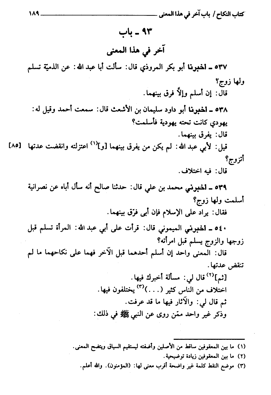 537 - أَخْبَرَنَا أبو بكر المروذي، قَالَ: سألت أبا عبد الله عن الذمية تسلم ولها زوج؟ قَالَ: إن أسلم وإلا فرق بينهما