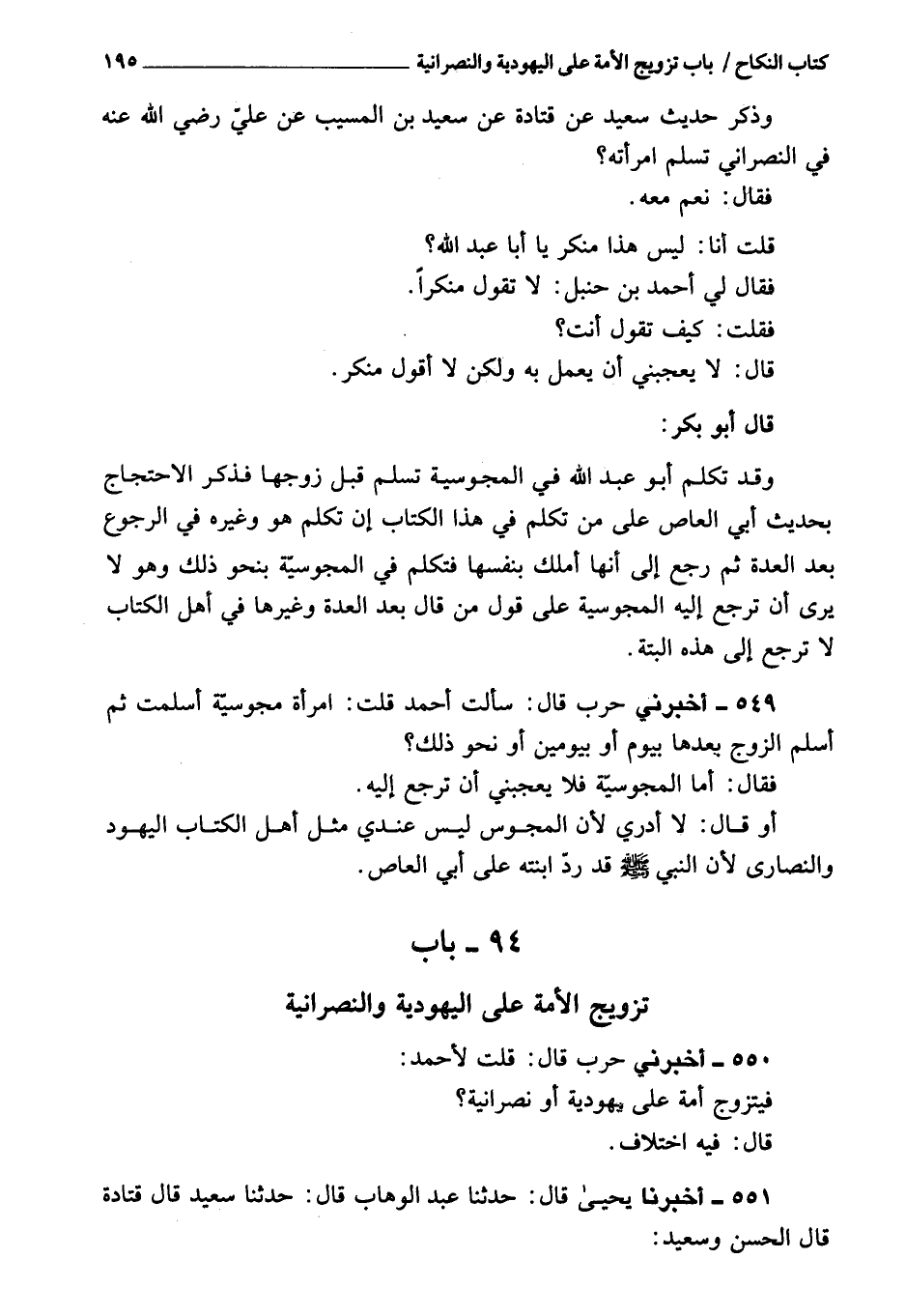 550 - أَخْبَرَنِي حرب، قَالَ: قلت لأحمد: فيتزوج أمة على يهودية، أو نصرانية؟ قَالَ: فيه اختلاف