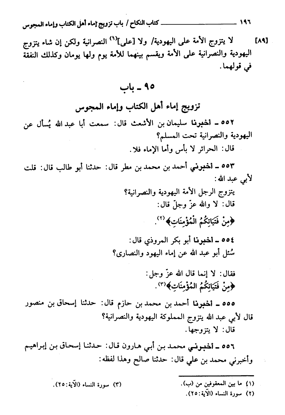 554 - أَخْبَرَنَا أبو بكر المروذي، قَالَ: سئل أبو عبد الله عن إماء اليهود والنصارى، فقال: لا، إنما قَالَ الله، عز وجل: {مِنْ فَتَيَاتِكُمُ الْمُؤْمِنَاتِ} [النساء: 25]