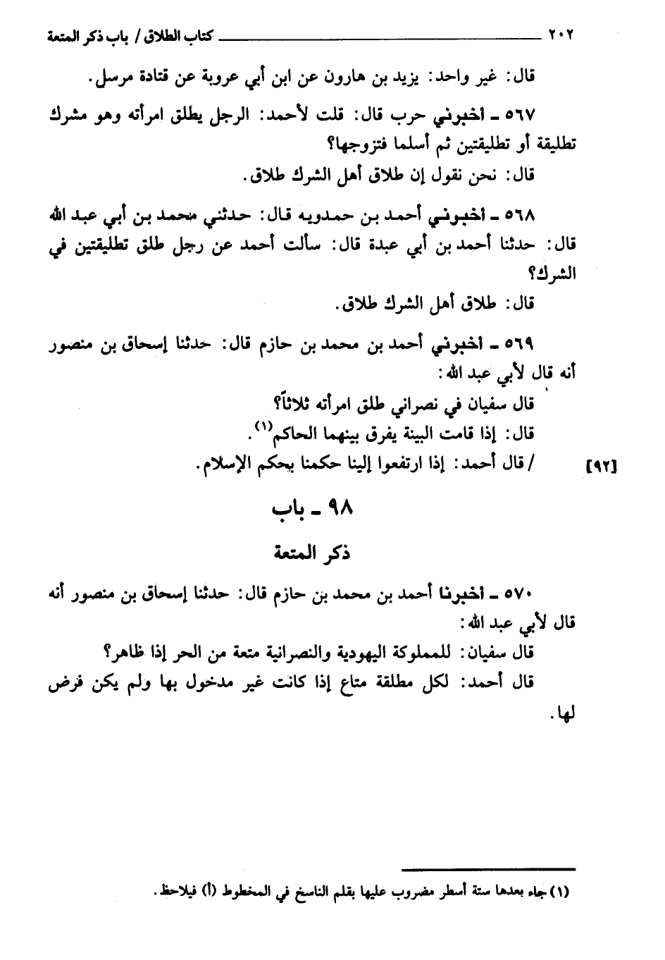 570 - أَخْبَرَنَا أحمد بن محمد بن حازم، قَالَ: حَدَّثَنَا إسحاق بن منصور، أنه قَالَ لأبي عبد الله: قَالَ سفيان: للمملوكة اليهودية والنصرانية متعة من الحر إذا ظاهر.