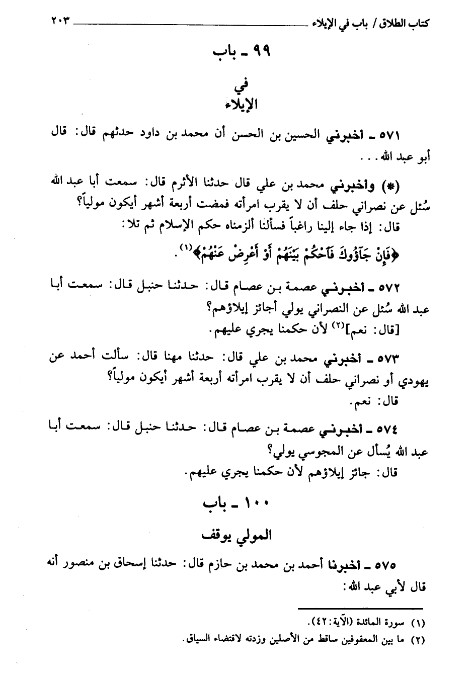 573 - أَخْبَرَنِي محمد بن علي، قَالَ: حَدَّثَنَا مهنا، قَالَ: سألت أحمد عن يهودي، أو نصراني حلف أن لا يقرب امرأته أربعة أشهر: أيكون موليا؟ قَالَ: نعم